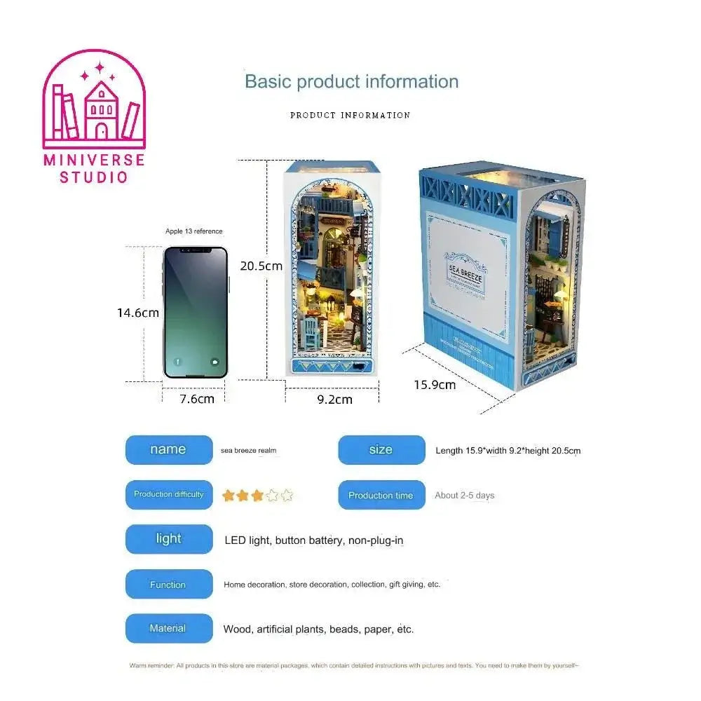 Dive into the “Sea Breeze Realm,” a charming miniature cabin depicting a warm and welcoming Mediterranean fishing village. This DIY kit includes realistic materials like wood, fabric, and paper to bring detailed maritime scenes to life. 📦 Production time: 2–5 days before shipping 🛠️ You assemble the scene using manual techniques: cutting, sewing, painting, and assembling 🔋 Requires 3 LR44 batteries (not included) 📐 Final size: 15.9 × 9.2 × 20.5 cm 👥 Recommended age: 14+ 🎁 Perfect as a gift, decoration, or artisanal collectible